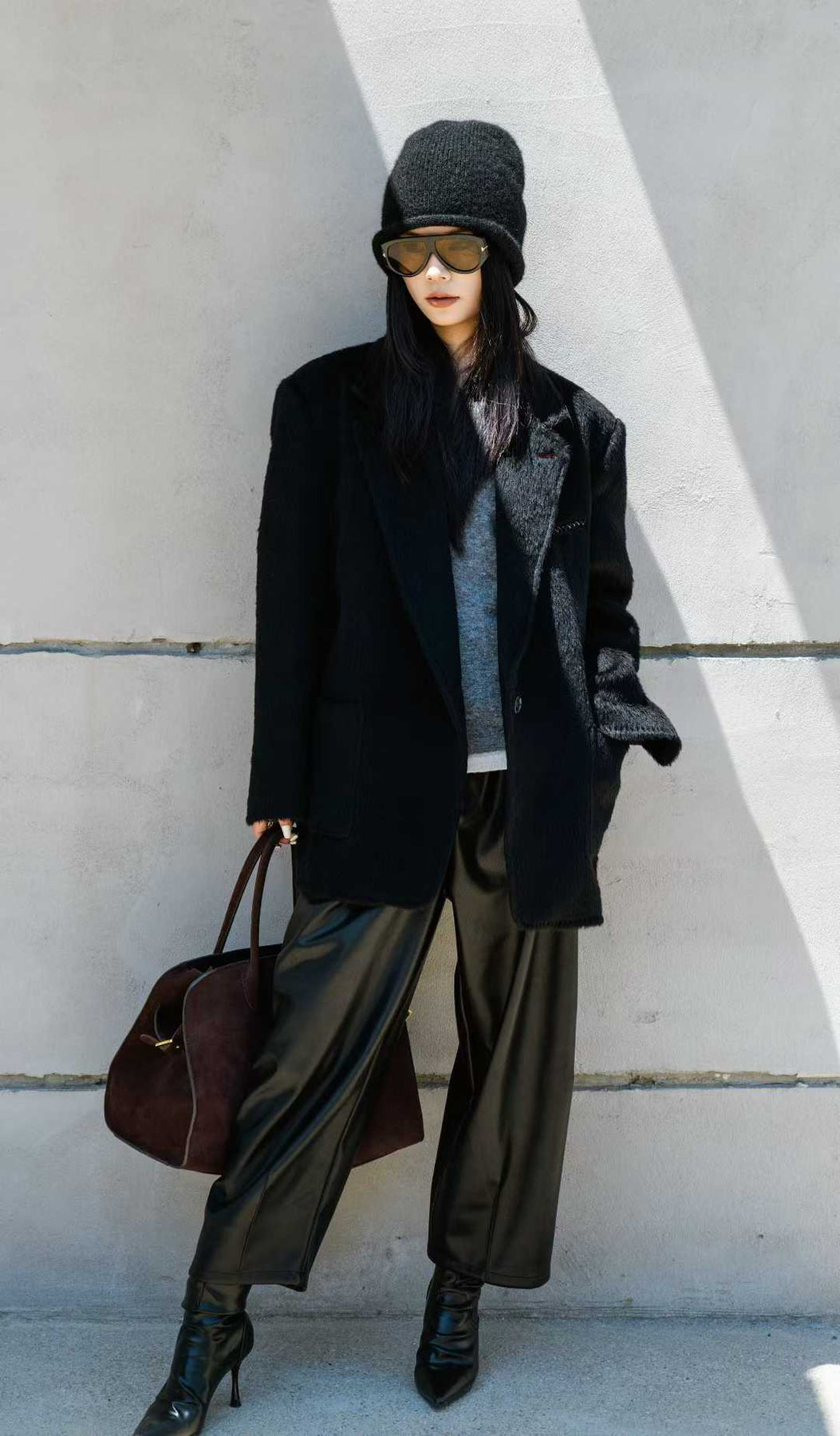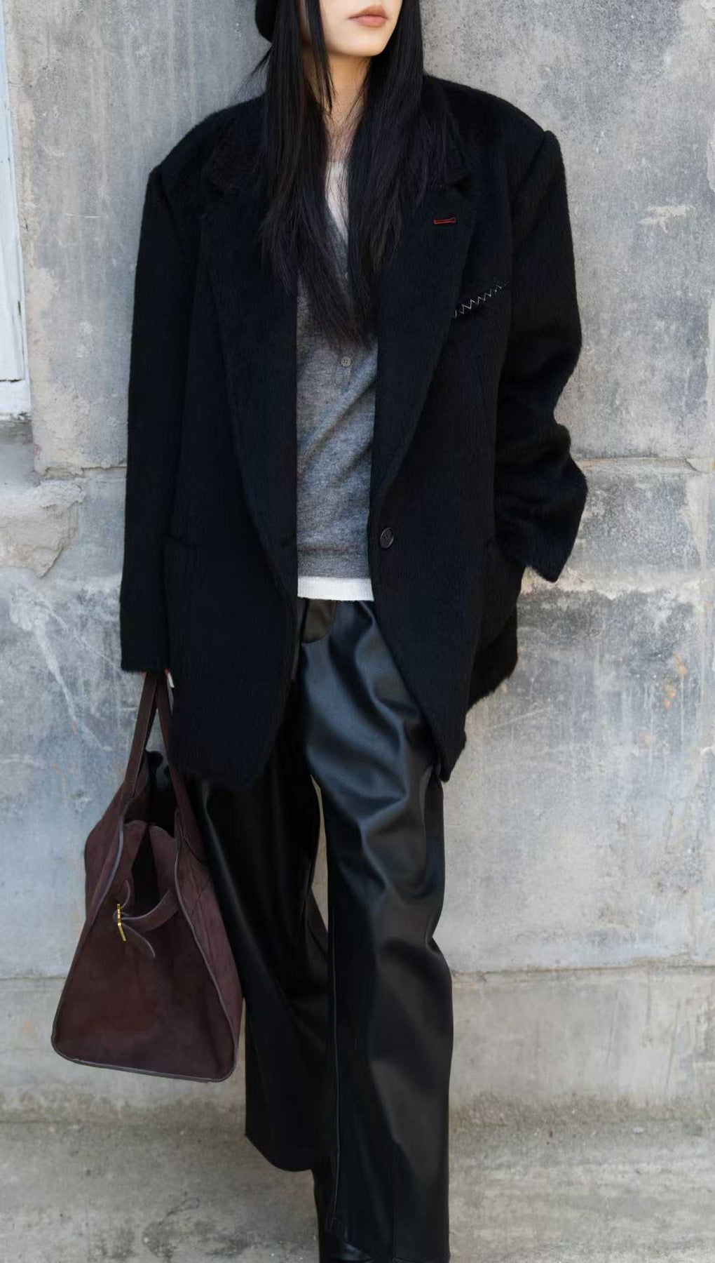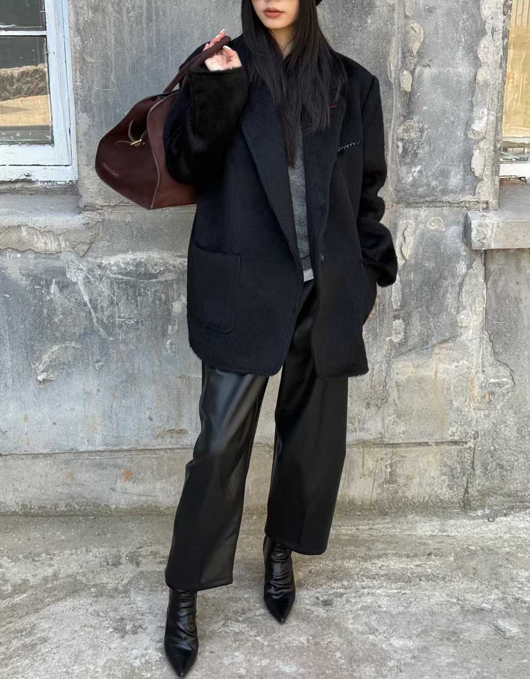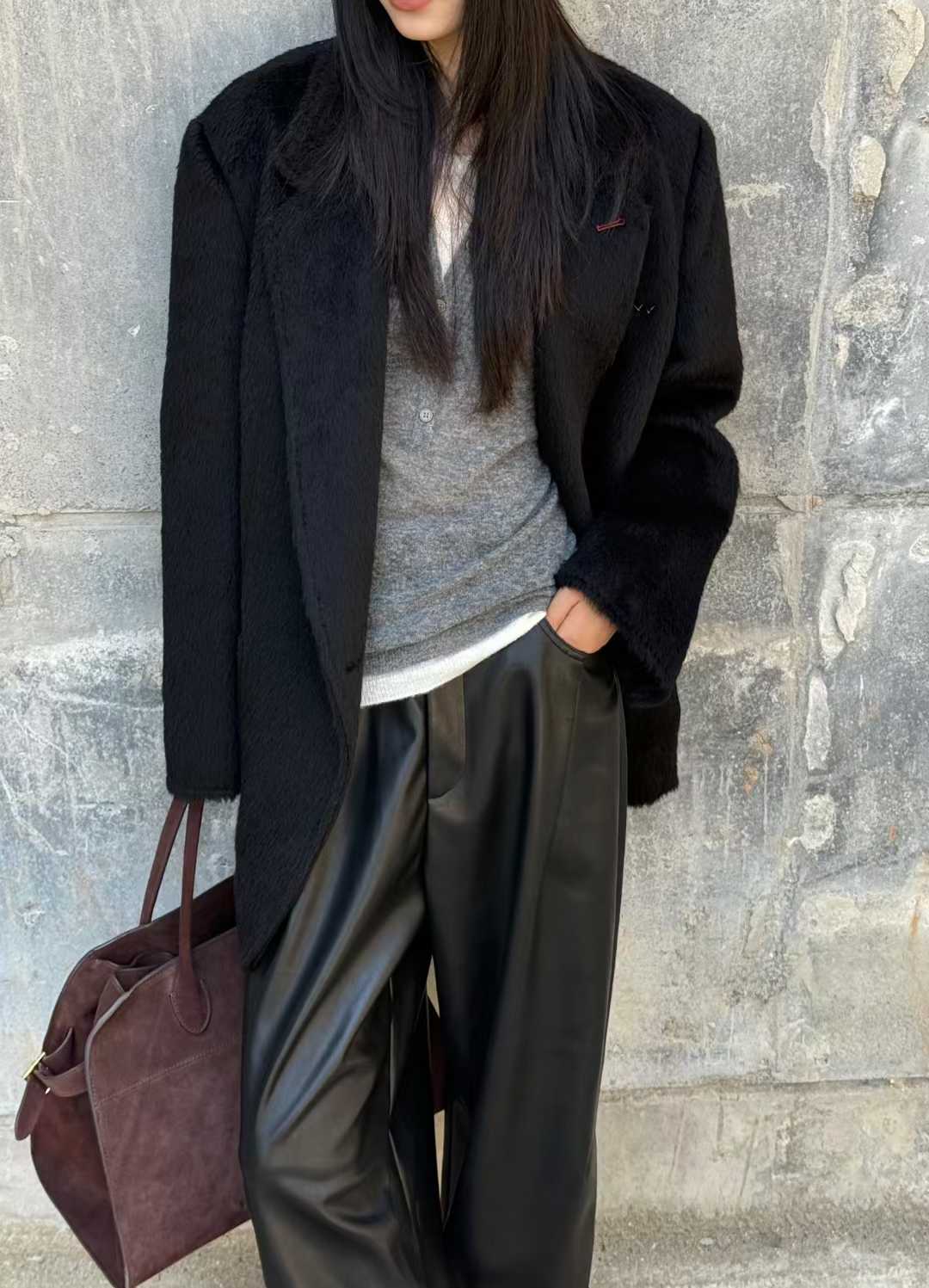 This Suri Alpaca Wide-Cut Blazer defines a silhouette of effortless ease and洒脱. The contrast buttons serve as an eye-catching accent, instantly drawing the eye. The charm of the Suri alpaca fabric is truly captivating – its fine fibers create soft, rippling highlights under the light, with a touch as cloud-like and gentle as it is cozy. It provides fluffy warmth while exuding a natural, high-end texture.