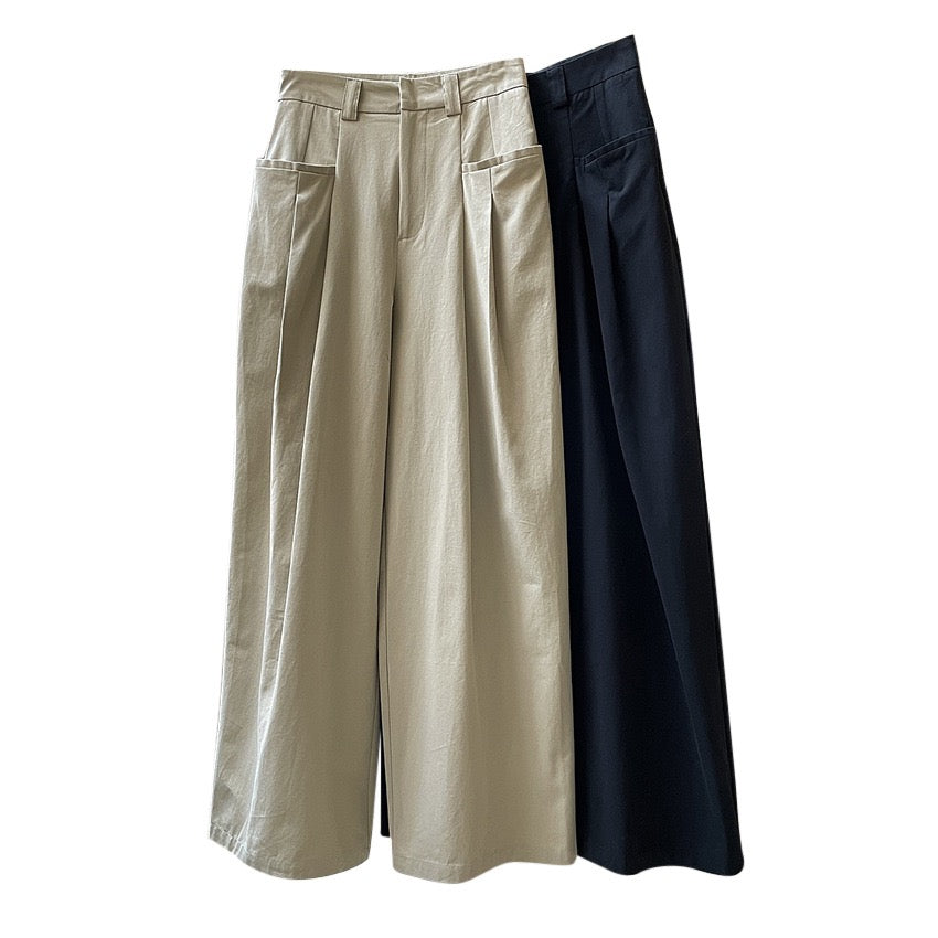 Our trousers feature a unique double pleat design, adding a touch of sophistication to a relaxed silhouette. The high-waisted fit ensures a flattering look, while the wide-leg cut allows for breathability and ease of movement. Whether you're dressing up for an evening out or keeping it casual for brunch with friends, these trousers are a stylish choice.